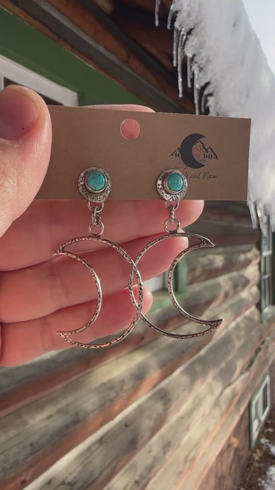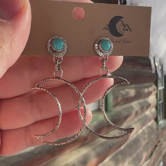 Kingman turquoise studs hold open crescent moons. This pair is fun and lightweight. Made from sterling silver— hand shaped and hammered for texture.